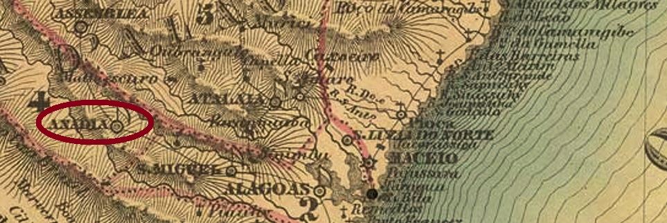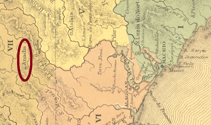 This settlement was originally called Campos do Arrozal de Inhauns (Rice Fields at Inhauns) and was located on the west bank of the river S. Miguel, 90 km west of the provincial capital Maceió. In July 1801, by Royal Decree (Alvará Real), it became Vila Nova de São João da Anadia, which has been a town since September 1895.