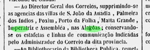 Three periods of operation were found for the local post office. For the first time, this agency was established in 1842, as stated in the Directory of Imperial Post Offices (Tabella das Agencias do Correio do Imperio, Rio de Janeiro, 1885) and confirmed by Aldo Cardoso in Contribuição para a História dos Correios de Alagoas (Maceió, 1969). The first period of operation ended in October 1847, as reported by the Rio de Janeiro press: