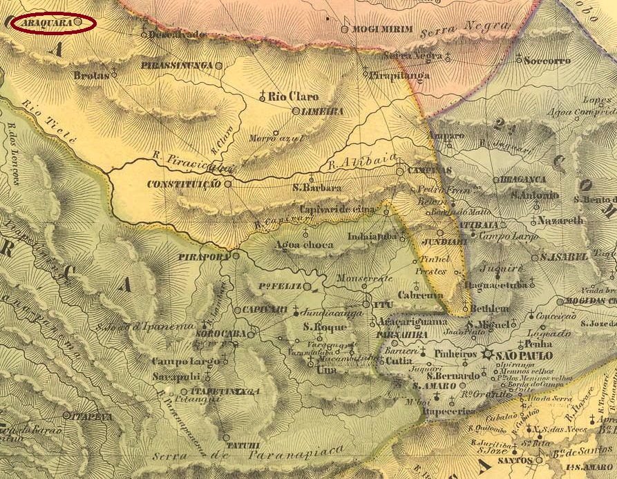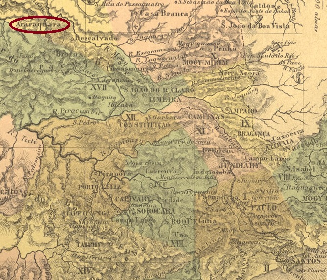 Am Ende des Kaiserreichs kam auch der Französischer Typus ASP-0050c (Abb. Luis C. Fritzen): oben liest man ARARAQUARA, unten ist der typische Stern zwischen Klammern. Das bisher einzige Exemplar trägt ein Datum aus 1889 in der Mitte.