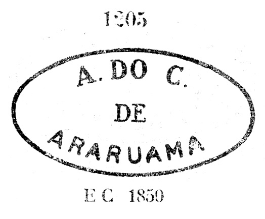 The local post office was established in January 1841, as noted by Nova Monteiro in Administrações e Agencias Postaes do Brasil Imperio (Brasil Filatelico/RJ, 1934-5; Reprint SPP 1994-1999). The first postmark is ARJ-0050a. It was demonstrably used between 1843 and 1857, exists also in blue, and has already been made known by Paulo Ayres (Catálogo de Carimbos Brasil-Império, S. Paulo, 1937, 1942) under Nr. 1204: