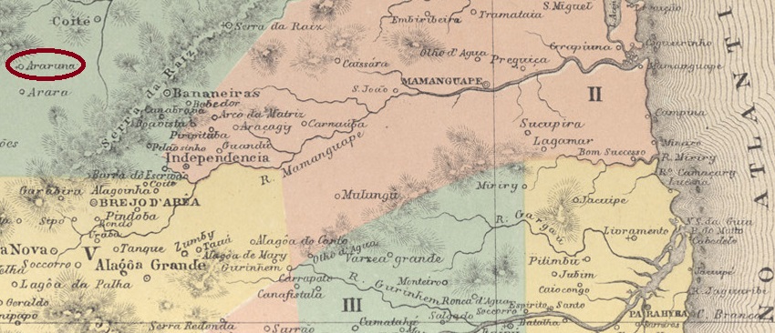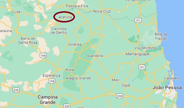 The settlement called N. Sra. da Conceição de Araruna originated around 1845 in the Município of Bananeiras and became a parish in July 1854, located 150 km northwest of the provincial capital Parahyba do Norte (today: João Pessoa). The place was declared a vila in July 1876 and has been a town since November 1938. The name comes from the Tupi-Guarani and means Black Macaw.
