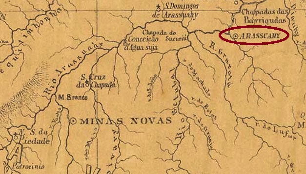 There were two places in the imperial province of Minas Gerais called Arassuahy, both located on the east bank of the river of the same name. The larger of these was originally called Calhau, a freguesia founded in June 1850 at the Município of Minas Novas, 570 km north of the capital Ouro Preto. It was declared a vila in July 1857 and a town in September 1871. In October 1885, the old place name Calhau returned – probably to avoid confusion with the other Arassuahy – but exactly two years later, the place name Arassuahy was restored.