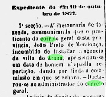 In the Directory of Imperial Post Offices (Tabella das Agencias do Correio do Imperio, Rio de Janeiro, 1885) we read that there had been a post office there since 1877. The first postal employee was presented in October by the local press: