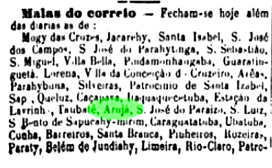 Ebenfalls noch unklar ist, wann das örtliche Postamt entstanden ist. Im Kaiserlichen Postführer (Guia Postal do Imperio, 1880) ist es gar nicht aufgelistet. Dabei wurde in der Regionalpresse ab August 1875 regelmäßig über Postverkehr über Arujá gemeldet: