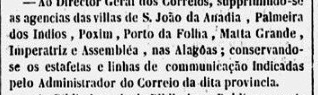 Es wurden zwei Betriebsperioden fürs örtliche Postamt gefunden. Die erste begann 1845, wie aus demVerzeichnis der kaiserlichen Postämter (Tabella das Agencias do Correio do Imperio, Rio de Janeiro, 1885) hervorgeht, und endete im Oktober 1847, wie die Amtspresse in Rio angekündigt hat: