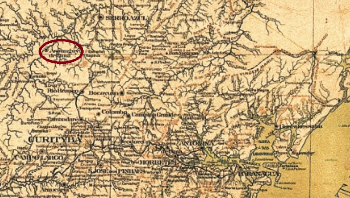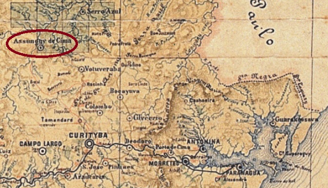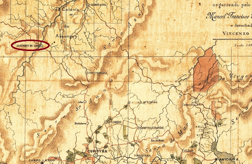 The colony of Assunguy de Cima (= Upper Assunguy) was founded in 1860 in the freguesia of Votuverava on the west bank of the Assunguy River, 70 km north of the provincial capital Curitiba. The place was declared a freguesia of N. Sra. do Amparo de Assunguy de Cima in 1876 and subsequently changed jurisdiction as a district three times: in February 1908 to the Município of Rio Branco, in October 1938 to Cerro Azul and in November 1951 to Rio Branco do Sul. This has remained until today, although the village is now written Açungui.