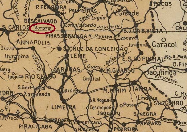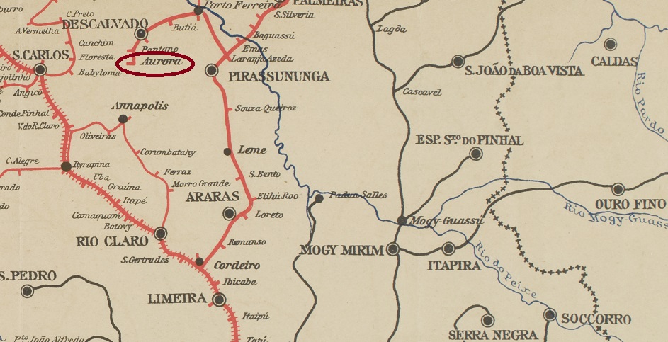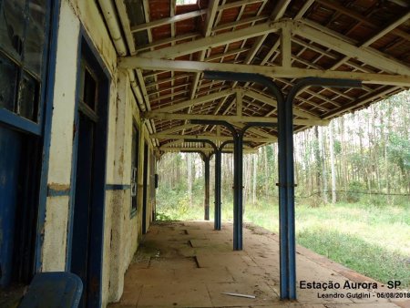 Der Bahnhof Aurora wurde im Januar 1889 durch die E.F. Descalvadense Bahngesellschaft eingeweiht und lag südlich des Provinzstädtchens Descalvado, 250 km nordwestlich der Hauptstadt São Paulo entfernt. Von 1891 bis zur Stilllegung 1960 gehörte die Strecke der Cia. Paulista de Estradas de Ferro. Heute sind die Schienen abgerissen, das Bahnhofsgebäude dient als Büro eines Landwirtschaftsbetriebs. Aurora hieß die Ehefrau eines der Großgrundbesitzer, die die Bahnlinie legen ließen (estacoesferroviarias.com.br).