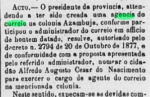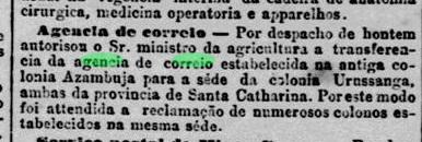 Die Agentur wurde allerdings im September 1887 zum benachbarten Urussanga verlegt, und erst im Februar 1898 eröffnete in Azambuja wieder die Post.