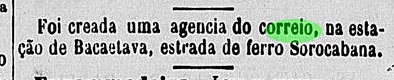 Bacaetava station was inaugurated in August 1880 by the E.F. Sorocabana Railway Company, Main Line, located in the Município of Porto Feliz, 130 km west of the provincial capital São Paulo. The railway line changed hands in 1892 to the Cia. União Sorocabana e Ytuana and from 1905 to 1928 it belonged to the E.F. Sorocabana e Ytuana. Then the station was deactivated, as the new company Sorocabana built a new railway line that relocated the station.