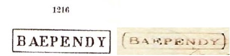 Der letzte Poststempel im Kaiserreich war BMG-0170d (Abb. aus dem Internet): ein schlichter Doppelkreis mit der Inschrift BAEPENDY oben. Die Daten in der Mitte gehen von 1877 bis 1895.