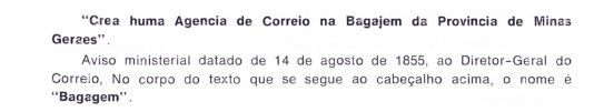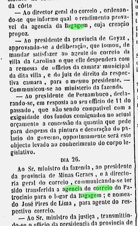 Die Wiedereröffnung des Postamts in Bagagem wurde aber gleich im Januar 1852 veranlasst. Da wurden Diamanten im Fluss entdeckt, und die Post zog von der Villa von Patrocínio zum Ort Bagagem zurück, der damals nicht einmal eine Freguesia war: