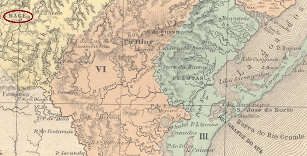 The settlement of Bagé began – as so often in border areas – as a soldiers’ camp, this time in July 1811 on the west bank of the Bagé stream, 380 km southwest of the later provincial capital Porto Alegre. Then, in January 1813, the chapel of S. Sebastião de Bagé was built, and by September 1815, the village had become a district to the Vila of Piratini. In June 1846 it was promoted to the status of Vila, and in December 1859 to the status of town.
