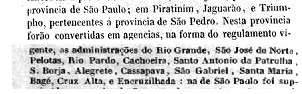 Three dates for the emergence of the local post office have been found. First in October 1831, as Nova Monteiro writes in Administrações e Agencias Postaes do Brasil Imperio (Brasil Filatelico/RJ, 1934-5; reprint SPP 1994-1999). Then in 1833, as one can read in the Directory of Imperial Post Offices (Tabella das Agencias do Correio do Imperio, Rio de Janeiro, 1885). And finally, around 1845 – that is, after the end of the Farroupilha Revolution, as can be seen in the Annuario Politico, Historico e Estatistico (Yearbook of Politics, History and Statistics, 1846):