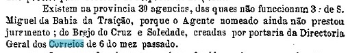 Zwei Entstehungsjahre fürs örtliche Postamt wurden gefunden. Erstmals im November 1882, wie im Postbericht (Relatorio dos Correios) fürs Jahr 1887 vermerkt. Dann 1884, wie im Verzeichnis der kaiserlichen Postämter (Tabella das Agencias do Correio do Imperio, Rio de Janeiro, 1885) zu lesen ist. Möglicherweise sind beide Daten korrekt, das zweite dürfte die Inbetriebnahme der Agentur sein. Denn noch im Oktober 1883 war das Postamt vakant, wie der Bericht des Provinzpräsidenten uns sagt: