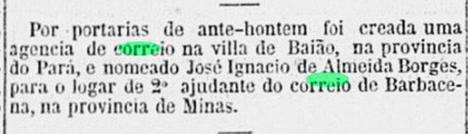 Zwei nah aneinander liegende Datum für die Entstehung des örtlichen Postamts wurden gefunden. Nova Monteiro schreibt dafür den April 1865 in Administrações e Agencias Postaes do Brasil Imperio (Brasil Filatelico/RJ, 1934-5; Reprint SPP 1994-1999), während die Presse aus Rio die dementsprechende Meldung drei Monate später veröffentlichte: