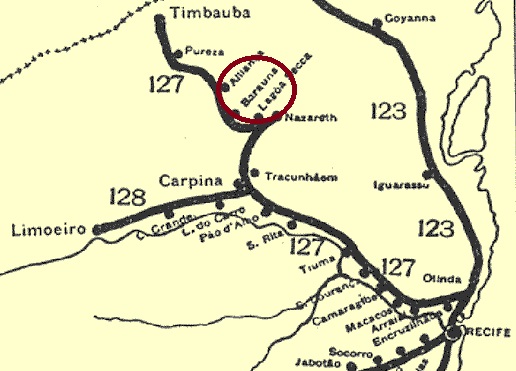 Baraúna station was inaugurated in January 1883 by the Great Western Railway Company and was located close to the banks of the Sirgi River in the Município of Nazaré, 90 km northwest of the provincial capital Recife. Since July 1909, the surrounding area has belonged to the Município of Aliança. The railway line went to Rede Ferroviária do Nordeste in 1950, and from 1975 until its closure in 1996 it belonged to Rede Ferroviária Federal S.A. (estacoesferroviarias.com.br). Today the station building is demolished, the rails are still there.