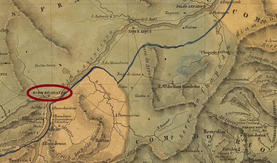 The Portuguese word Barra means, among others, a river mouth. This was the case in December 1752, when the freguesia of São Francisco das Chagas da Barra do Rio Grande do Sul was founded, almost 700 km west of the future provincial capital Salvador. One should remember firstly that the locality was still in Pernambuco at that time because the entire left bank of the São Francisco River up to the border with the Capitania of Minas Gerais still belonged to Pernambuco until the failed revolution in 1817. And secondly, Rio Grande do Sul here has nothing to do with the province of the same name in the extreme south of the country, but refers to the Rio Grande, which rises on the border with Goiás and flows into the São Francisco, precisely at its barra.