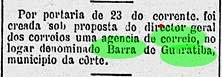 Das örtliche Postamt entstand im Oktober 1883, wie in der Rio-Presse zu lesen ist: