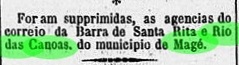 Bisher wurde kein kaiserlicher Poststempel aus Barra de Santa Rita gesehen. In dieser Freguesia hatte es zwischen Januar und Juni 1874 ein Postamt namens Santa Rachel (siehe SRJ-0883) gegeben.