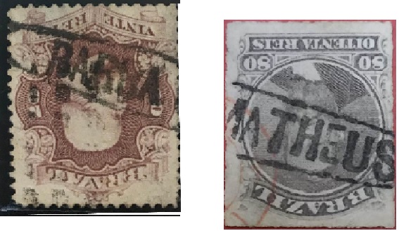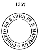 Danach kam BES-0035c (Abb. Jorge L. Pedreira): ein Doppelkreis mit der Inschrift B. DE S. MATHEUS oben und inneren Daten von 1877 bis 1897. Durch R. Koester (Carimbologia III) kennen wir auch BES-0035d (RK) der mit Daten von 1885 in den Farben Blau und Rot vorkommt: