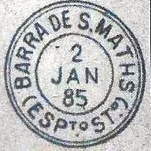 Then came BES-0035c (image: Jorge L. Pedreira): a double circle with the inscription B. DE S. MATHEUS at the top and internal dates from 1877 to 1897. Through R. Koester (Carimbologia III) we also know BES-0035d, which occurs with dates from 1885 in blue and red: