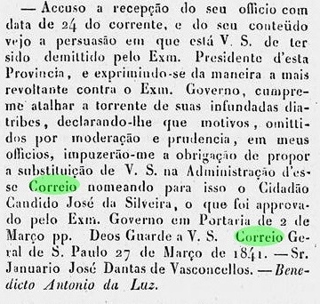 Two dates of origin for the local post office were found. The first was in August 1829, as can be read in Nova Monteiro’s Administrações e Agencias Postaes do Brasil Imperio (Brasil Filatelico/RJ, 1934-5; Reprint SPP 1994-1999). The second agency creation is said to have taken place in 1844, as listed in the Directory of Imperial Post Offices (Tabella das Agencias do Correio do Imperio, Rio de Janeiro, 1885). It has not been possible to find out when the agency was closed in the meantime. In March 1841 there was another turbulent change of postal agent, as reported in the regional press: