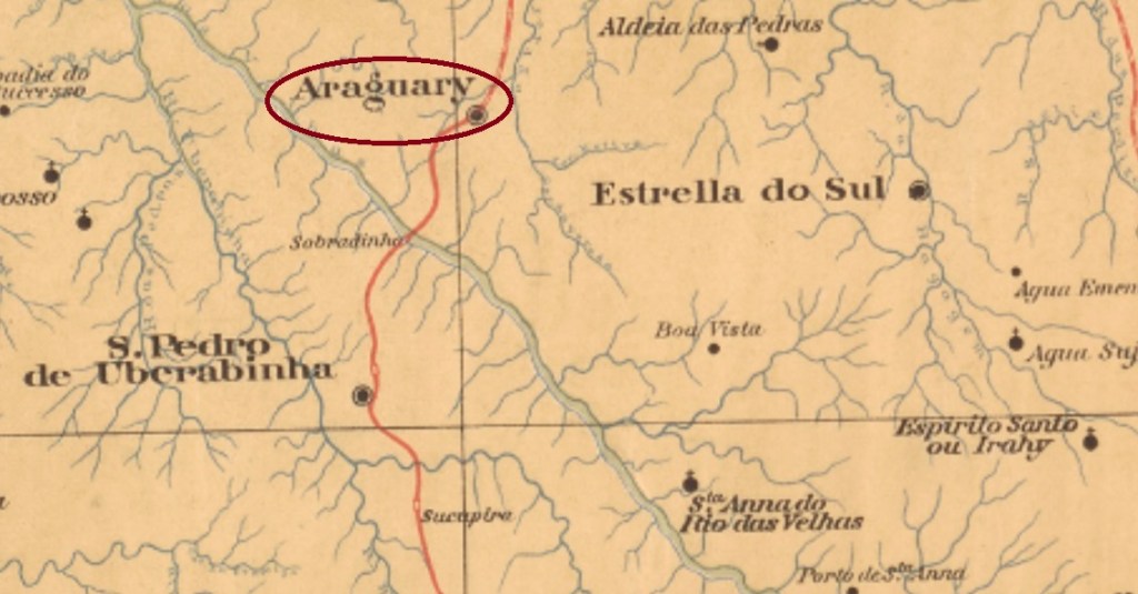 This village was the Freguesia of Brejo Alegre (Happy Swamp) from April 1864, belonging to the Município of Bagagem, located 650 km west of the provincial capital Ouro Preto. In October 1882 it became a vila and in August 1888 a town, named Araguary, after the great river that flows a few kilometres to the south, which was called earlier Rio das Velhas.