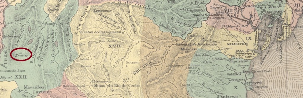 The freguesia of N. Sra.das Brotas was founded in March 1847 in the município of Macaúbas, located on the east bank of the river Riacho das Telhas, 610 km west of the provincial capital Salvador da Bahia. In July 1878, it was promoted to a villa as an agricultural colony, under the name Villa Agricola de N. Sra. das Brotas de Macaúbas. In June 1931 the place name was shortened to Brotas, but in December 1943 the old designation Brotas de Macaúbas returned.