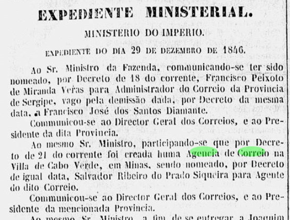 Die Agentur wurde im Dezember 1855 geschlossen, so Aureo G. Santos (Agências de Correio Criadas e Suprimidas 1851, 1855, 1856 e 1857, in Brasil Filatélico 181, Rio de Janeiro, 1977), wurde aber ein Jahr später wieder eröffnet, wie im Verzeichnis der kaiserlichen Postämter (Tabella das Agencias do Correio do Imperio, Rio de Janeiro, 1885) angegeben.