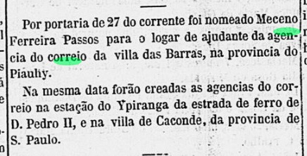 Wie aus der Rio-Presse hervorgeht, gab es dort ein Postamt ab April 1865: