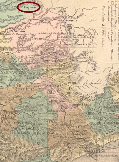 The Chapel S. Bento do Cajuru was built in March 1835 in the Município Batatais, 300 km north of the provincial capital São Paulo. In February 1846, it became a freguesia of the municipality of Casa Branca, but returned to Batatais in June 1850. Since March 1865, Cajuru has been a vila in its own município, which became a town in December 1906.