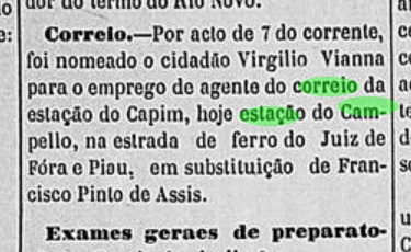 Daraus folgt, dass ein Postamt Capim von 1881 bis etwa 1885 bestanden haben könnte. Sicher ist, dass Ende 1887 die Postagentur am Bahnhof von Campello eröffnet wurde: