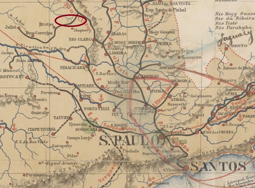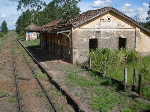 Campo Alegre station was opened in July 1885 by the E.F. Rio Clarense (Jaú branch) railway company in the Município Brotas, 230 km northwest of the provincial capital São Paulo. The line passed to the Rio Claro Railway in 1888, to the Cia. Paulista de Estradas de Ferro in 1892 and belonged to FEPASA from 1971 until its closure in 1998. Today the tracks are still there, the station building is in ruins (estacoesferroviarias.com.br).