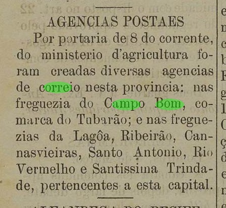 Bemerkenswert ist, dass der Ort noch als Campo Bom erwähnt wurde, obwohl zu diesem Zeitpunkt der neue offizielle Name Jaguaruna bereits seit vier Jahren in Kraft war. Es ist daher möglich, dass es einen kaiserlichen Poststempel unter Campo Bom gibt, zumal Jaguaruna-Stempel erst ab 1890 bekannt sind.