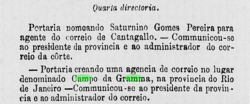 Campo da Gramma (Rasenfeld) war eine kleine Siedlung der Freguesia de Bemposta, die damals zur Vila de Parahyba do Sul gehörte und am Ostufer des Piabanha, 120 km nördlich der Hauptstadt Rio de Janeiro, lag. Im Jahre 1861 wurde dort eine Estação (Haltestelle, kein Bahnhof) der Gesellschaft União e Industria gebaut. Es handelte sich um die erste befestigte Fernstraße Brasiliens, ein Prestigeprojekt, das die Stadt Petropolis in Rio mit Juiz der Fora in der Provinz Minas Gerais durch einen Postkutschendienst verbinden sollte.