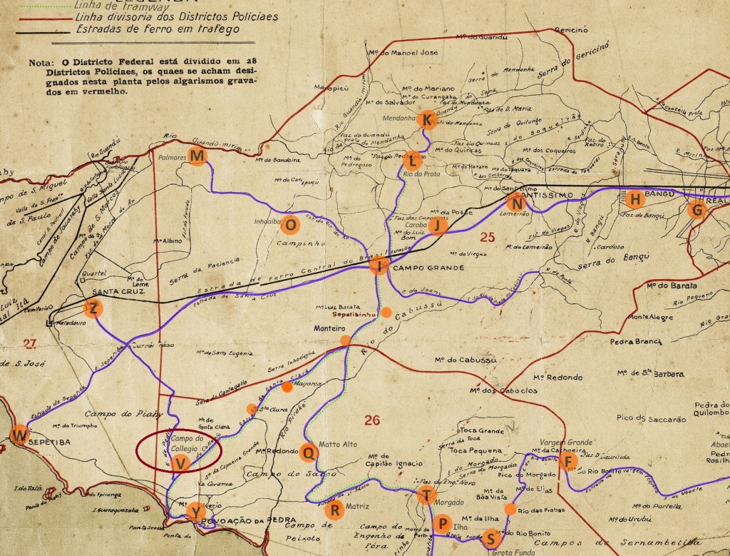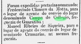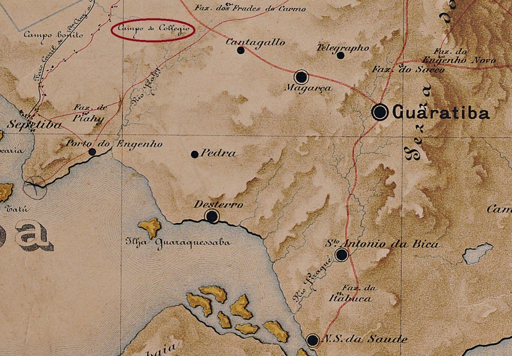 Hier haben wir einen weiteren Ort im brasilianischen Kaiserreich, über den so gut wie nichts bekannt ist, weder über die Entstehungszeit noch darüber, warum es dort überhaupt ein Postamt gab. Campo do Collegio (Schulfeld) lag an der Freguesia von Guaratiba auf dem Weg nach Sepetiba, 65 km westlich der Hauptstadt Rio de Janeiro. Das ist bis heute so geblieben, nur dass die schöne Landschaft von damals wohl unwiederbringlich verloren gegangen ist.