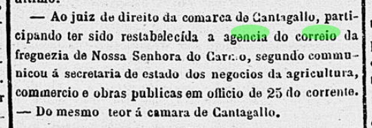As R. Koester (Carimbologia IX) and Paulo Novaes (agenciaspostais.com.br) write, there had been a post office there since 1853. However, it was closed sometime after 1858, as the Rio press reported its reopening in July 1861: