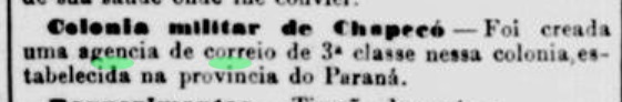 Settlement began around 1839 as Povoação de Campo de Palmas, 560 kilometres west of the future capital Florianópolis, but still part of the province of São Paulo. In August 1853, it became a colony called Vila de Palmas, which then belonged to the province of Paraná. The territory aroused covetousness in Argentina, which is why the Brazilian Empire established a military colony called Xapecó in November 1859. However, this did not begin operations until March 1882, a sign of political détente.