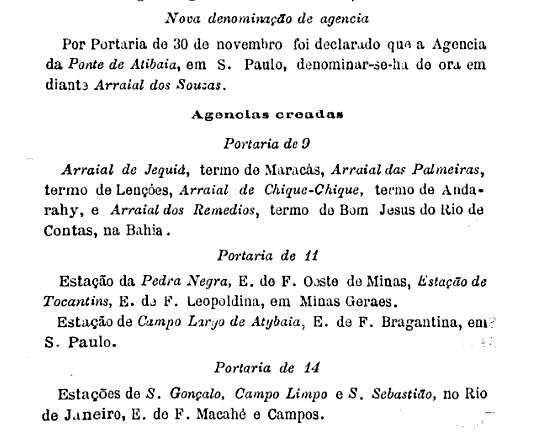Das örtliche Postamt wurde im November 1889 ins Leben gerufen, eine Woche vor dem Ende des brasilianischen Kaiserreichs, wie aus dem Postbericht (Boletim Postal) des folgenden Monats hervorgeht: