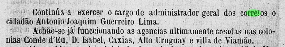 The local post office was created in 1881, as R. Koester writes in Carimbologia XIV and the provincial president’s report the following year confirms:
