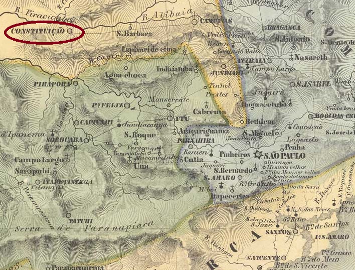 N. Sra. dos Prazeres de Piracicaba was a settlement on the south bank of the Piracicaba River, 160 kilometres northwest of the later provincial capital of São Paulo, from August 1767. In June 1774 it was incorporated as Freguesia de Sto. Antonio de Piracicaba to the Vila de Itu. In October 1821, the place name changed again, this time to Vila de Nova Constituição, in memory of the then new Portuguese constitution. It was declared a town under this name in April 1856 and returned to its original name of Piracicaba in March 1877.