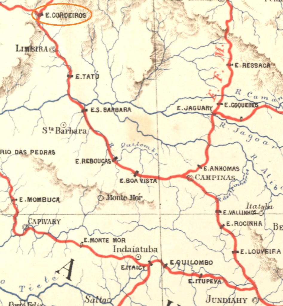 Cordeiros station in the province of São Paulo was opened in August 1876 by the railway company Cia. Paulista (main line) and was located on the west bank of the Ribeirão do Tatu in the Município de Limeira, 160 km north-west of the provincial capital. The line belonged to FEPASA from 1971 until its closure. Today, the tracks still exist, the station is being renovated and will house both a railway museum and the municipality’s cultural office.