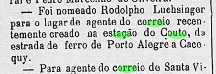 R. Koester schreibt jedoch in Carimbologia XIV, dass die Postagentur erst im Dezember ihre Arbeit aufnahm, also bereits in der Republik. Seine Einschätzung wird dadurch bestätigt, dass der erste Poststempel CRS-0130a (Abb. aus dem Internet) noch keine Daten aus der Kaiserzeit aufweist:
