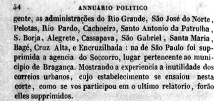 Wie Nova Monteiro in Administrações e Agencias Postaes do Brasil Imperio (Brasil Filatelico/RJ, 1934-5; Reprint SPP 1994-1999) schreibt, gab es dort seit Oktober 1831 ein Postamt. Dieses wurde wahrscheinlich während des Farroupilha-Aufstandes (1835-1845) geschlossen und erst im Dezember 1845 wieder eröffnet, wie R. Koester in Carimbologia XIV berichtet. Dies wird durch das offizielle Jahrbuch für Politik, Geschichte und Statistik des folgenden Jahres bestätigt:
