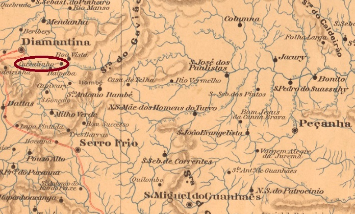 The village of Curralinho in the province of Minas Gerais was a settlement of the Vila de Diamantina on the north bank of the Ribeirão do Inferno (Hell’s Stream), 400 kilometres north of the provincial capital Ouro Preto. It was elevated to a freguesia in September 1862 and has been the district of Extração (extraction) since September 1923.