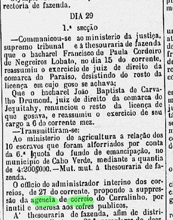 Paula Sobrinho nennt in História Postal de Minas Gerais (Belo Horizonte, 1997) ein Gründungsdatum im September 1901, es dürfte sich aber um eine Wiedereröffnung handeln, da die Agentur laut der regionalen Presse 1886 geschlossen werden sollte: