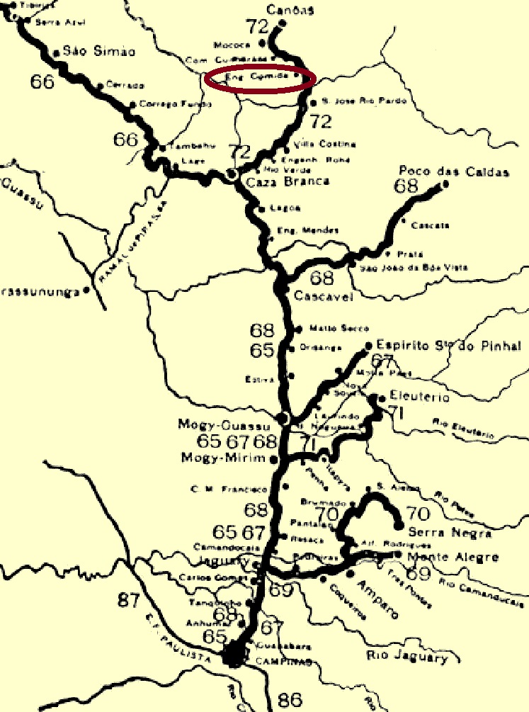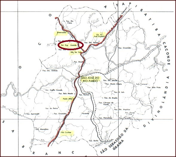 Engenheiro Gomide station was opened in August 1889 by the railway company Cia. Mogiana, Mococa line, in the Município de S. José do Rio Pardo, 270 km north of the provincial capital of São Paulo. The name commemorates the Mogiana engineer Candido Gonçalves Gomide. The railway line was closed in 1966, today the tracks have disappeared, and the station building was a warehouse in 1999 (estacoesferroviarias.com.br).