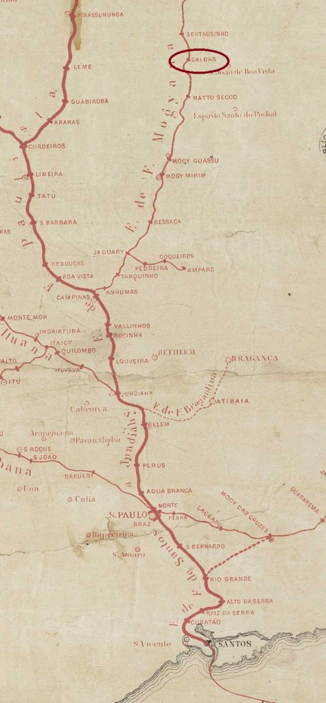 The Caldas (Thermes) railway station was opened in January 1878 by the Cia. Mogyana railway company (main line) and was in the Município S. João da Boa Vista, 200 km north of the provincial capital São Paulo. In 1886, the station was renamed after the Mogyana engineer Manoel da Silva Mendes, who died in June 1884. The area around the station belonged to the Cascavel district from August 1898 and has been in the Município Aguaí since November 1944. The railway line belonged to the FEPASA company from 1971 until its closure. Today, the tracks are still there, but the station building no longer exists.