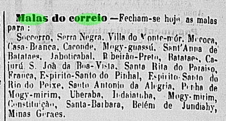 The railway station was built in November 1883 by the Cia. Mogyana railway company and was located about 3 km south of the town centre. According to the 1885 list of imperial post offices (Tabella das Agencias do Correio do Império), the station post office was established in 1884. This is confirmed by the press from Rio: