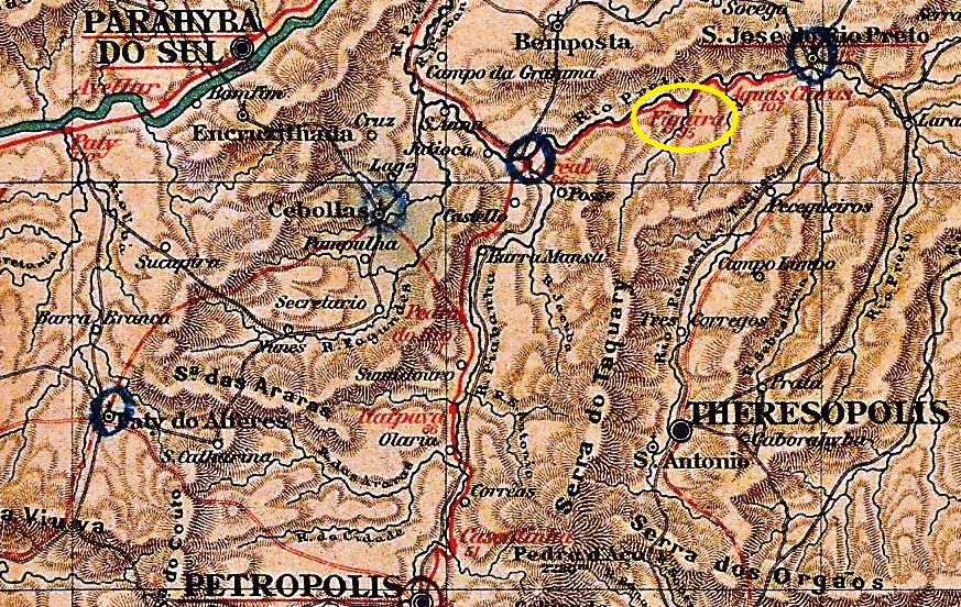 Figueira station was opened in November 1886 by the railway company E.F. do Grão-Pará (Rio Preto Branch) and was located on the south bank of the Rio Preto in the Município Petrópolis, 110 km north of the capital Rio de Janeiro. The name comes from the nearby Fazenda da Figueira. The line belonged to E.F. Leopoldina from 1890 until it was closed in 1947. From around 1935, the station was called Tristão Câmara, after the owner of the Fazenda da Figueira since 1853. Around 1945, the entire area around the station was flooded during the construction of a dam. Since December 1987, the lost railway station has been in the Município S. José do Vale do Rio Preto.
